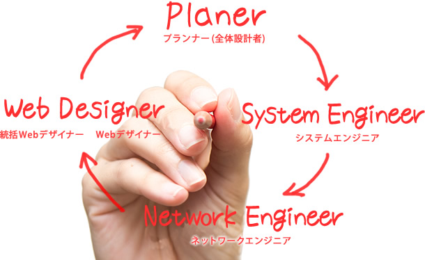 当社では、プランナー(全体設計者)、統括Webデザイナー、Webデザイナー、システムエンジニア、ネットワークエンジニアが ホームページにたずさわり、緻密で総合力が高く、バランスの良いホームページを制作・運営しています。